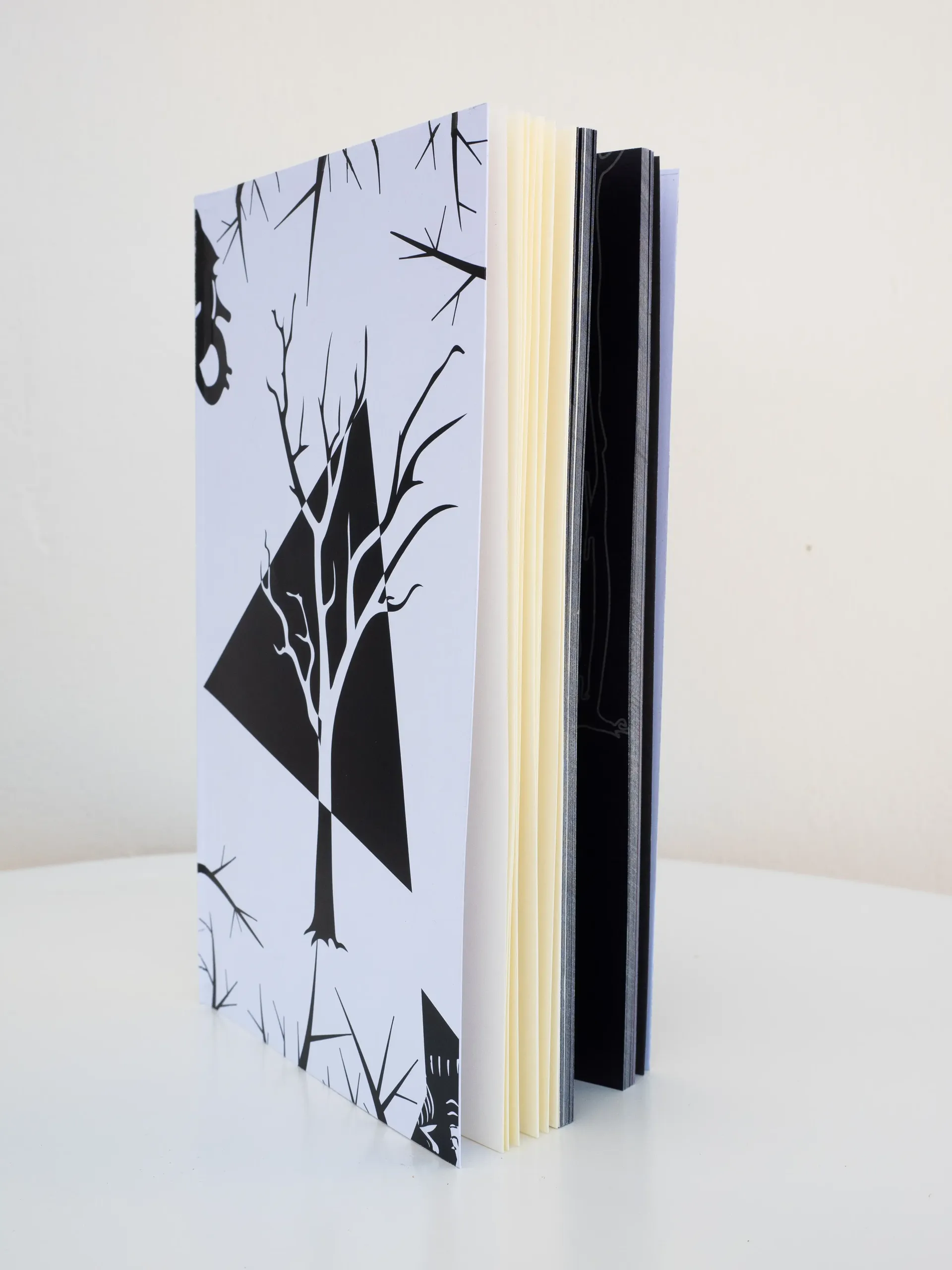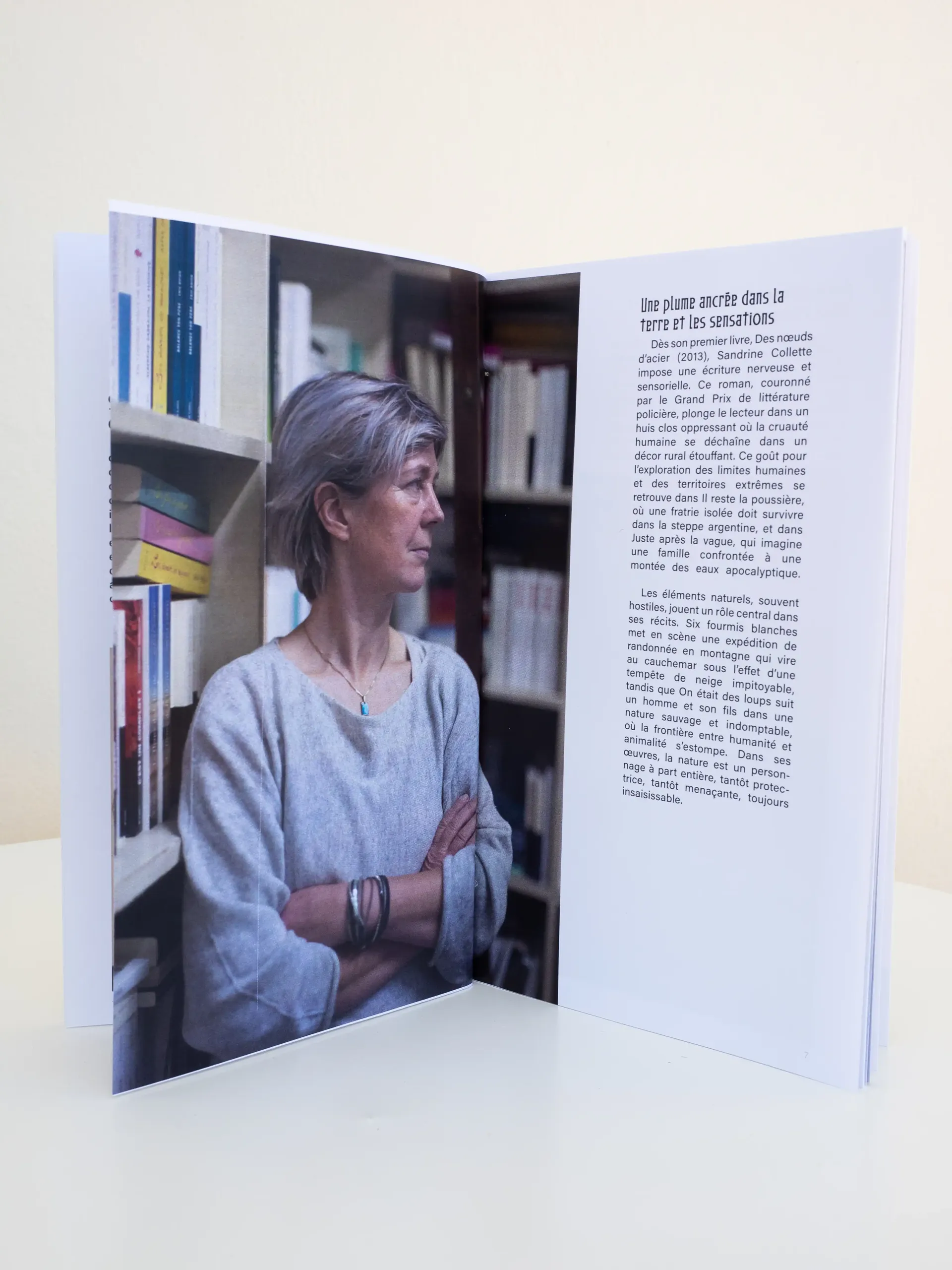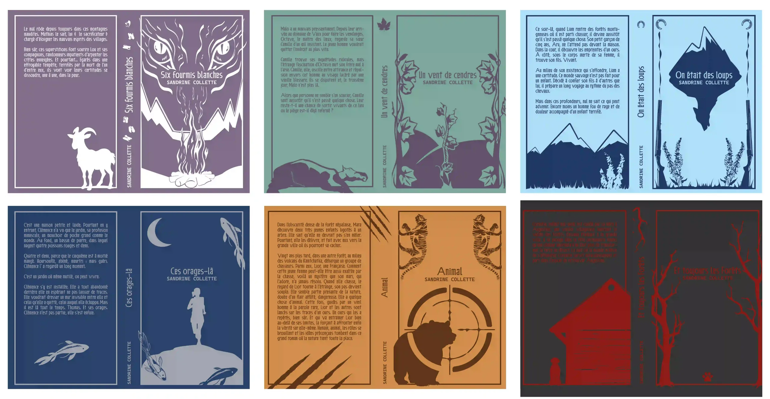 Travail sur un coffret d’artiste, j’ai choisi l’écrivaine Sandrine Collette. J’ai retravaillé certaines des couvertures de l’artiste pour faire ressortir une unité graphique et donner un attrait au livre. Le coffret est également composé de deux éditions, une reprenant l’histoire de son livre «Et toujours les forêts», et une autre servant de bio et bibliographie de l’autriceDimensions couvertures : 11×18cm pour la 1re et 4eDimensions éditions : 14×24cm | 180 pages Et toujours les Forêts